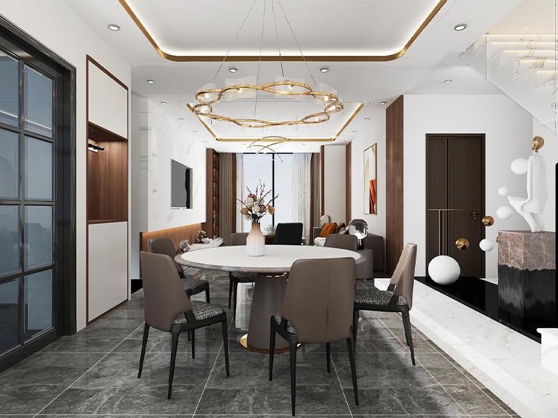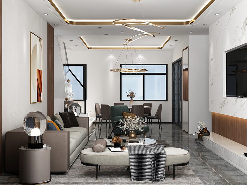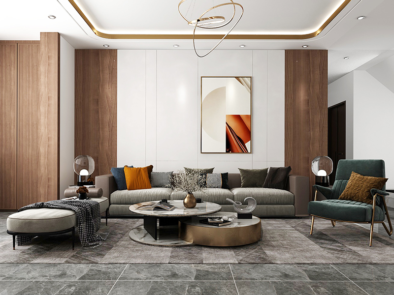 ??濟(jì)南阿達(dá)森裝飾為穎秀華府打造的現(xiàn)代極簡輕奢風(fēng)。淺米色大尺寸沙發(fā)柔化空間,搭配焦糖棕單人椅,用撞色拉出層次感;黑白紋理茶幾與同質(zhì)感背景墻呼應(yīng),高級又利落。深色木飾面 +