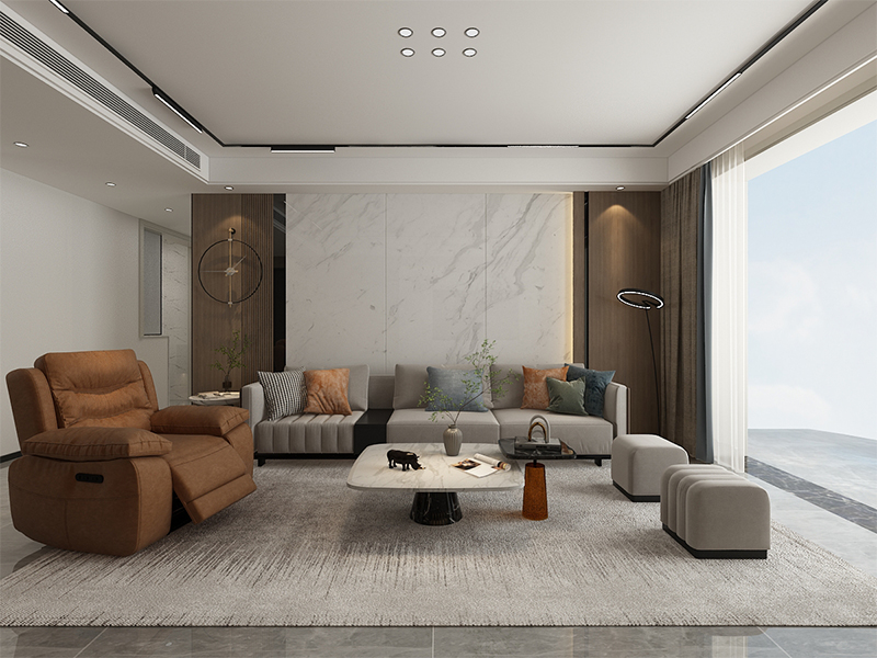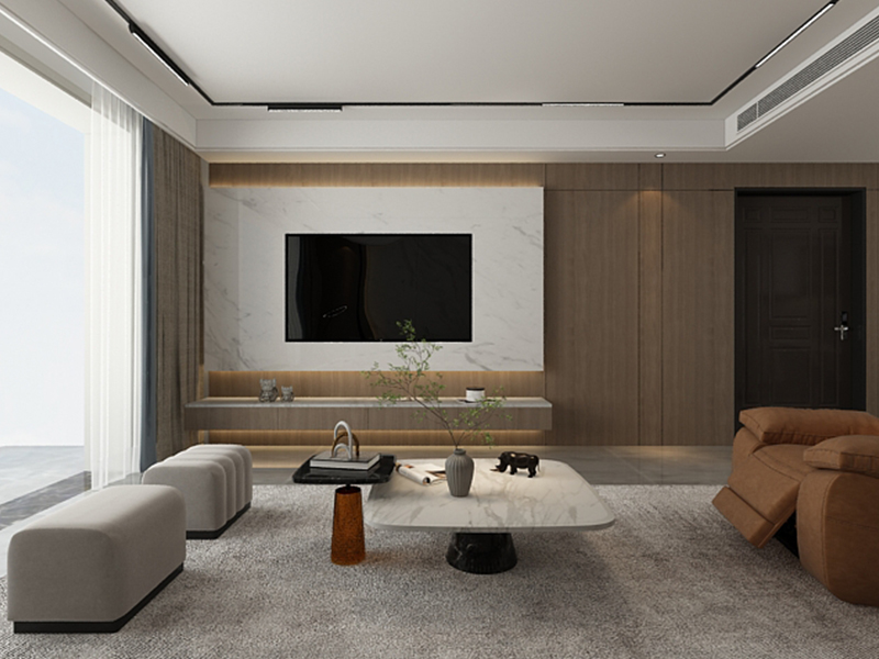 ??濟(jì)南阿達(dá)森裝飾為穎秀華府打造的現(xiàn)代極簡輕奢風(fēng)。淺米色大尺寸沙發(fā)柔化空間,搭配焦糖棕單人椅,用撞色拉出層次感;黑白紋理茶幾與同質(zhì)感背景墻呼應(yīng),高級(jí)又利落。深色木飾面 +