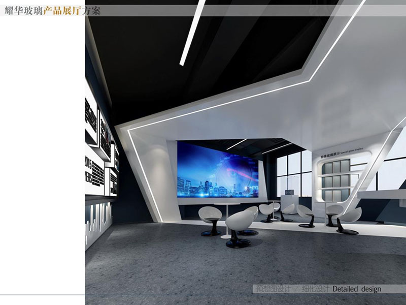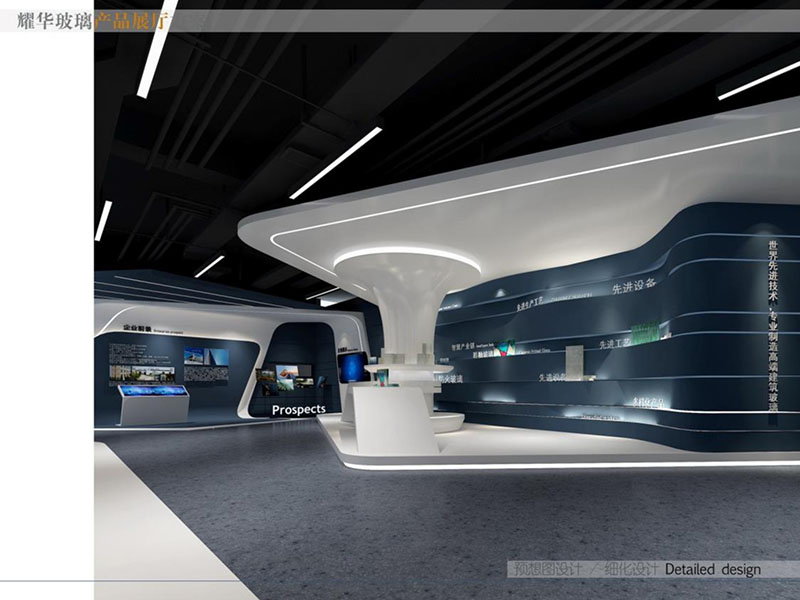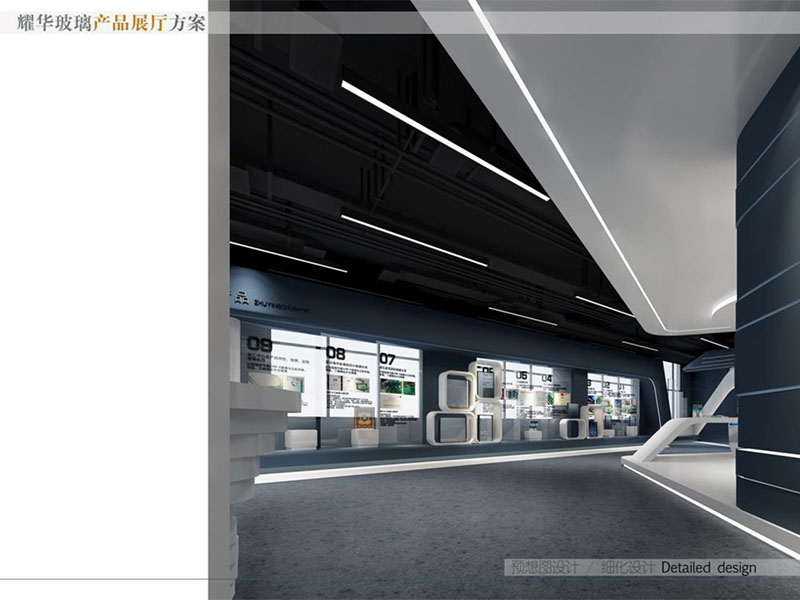 設計理念: 耀華玻璃產品展廳裝修設計效果展現(xiàn)了高端與專業(yè)的品牌形象。展廳內的大部分東西都是使用的耀華玻璃仔細打造而成。采用明亮的燈光布局,突出了玻璃產品的晶瑩剔透之美。既方便客戶參觀,又彰顯了耀華玻璃的技術實力。整體設計融合了現(xiàn)代美學與產品特性,營造出專業(yè)、高端的觀展體驗。